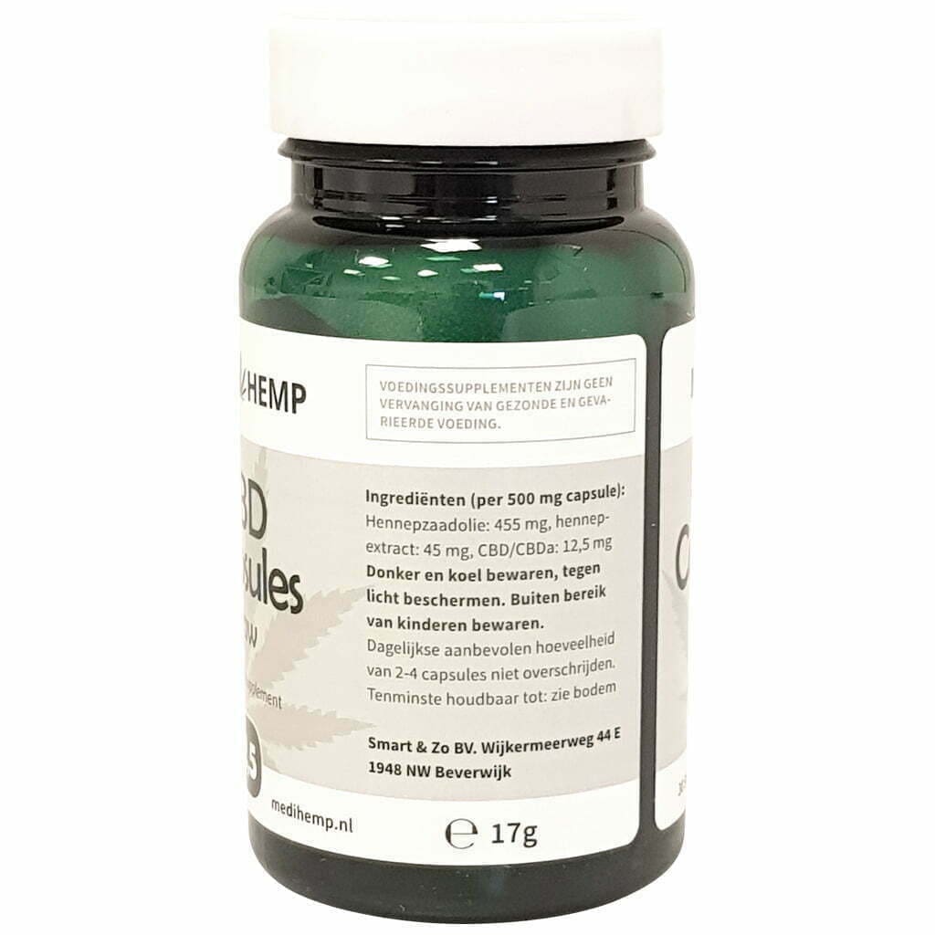 De capsules van Medihemp zijn vernieuwd! Sinds November 2021 in een nieuwe kleinere verpakking met 60 kleine capsules i.p.v. 30 grote capsules. De kleinere CBD capsules zijn makkelijker in te nemen. De dosering is aangepast van 1 capsule naar 2 capsules per keer. Het aantal milligrammen CBD extract is iets verhoogd. Voor de 2,5% is dit nu ~13,5 mg per 2 kleine capsules, ipv 12,5mg in 1 grote capsule zoals voorheen.