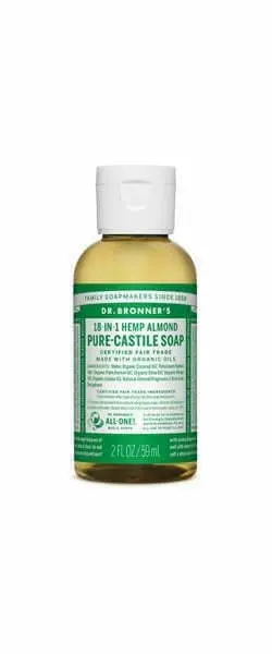Dr Bronner Magic Soap Amandel 60ml Dr. Bronners is wereldwijd bekend om zijn eenvoudige, pure formules van plantaardige zepen. Biologisch en Fair Trade, Natuurlijke Cosmetica, 18-in-1 gebruikswijzen, volledig biologisch afbreekbaar en plantaardig.