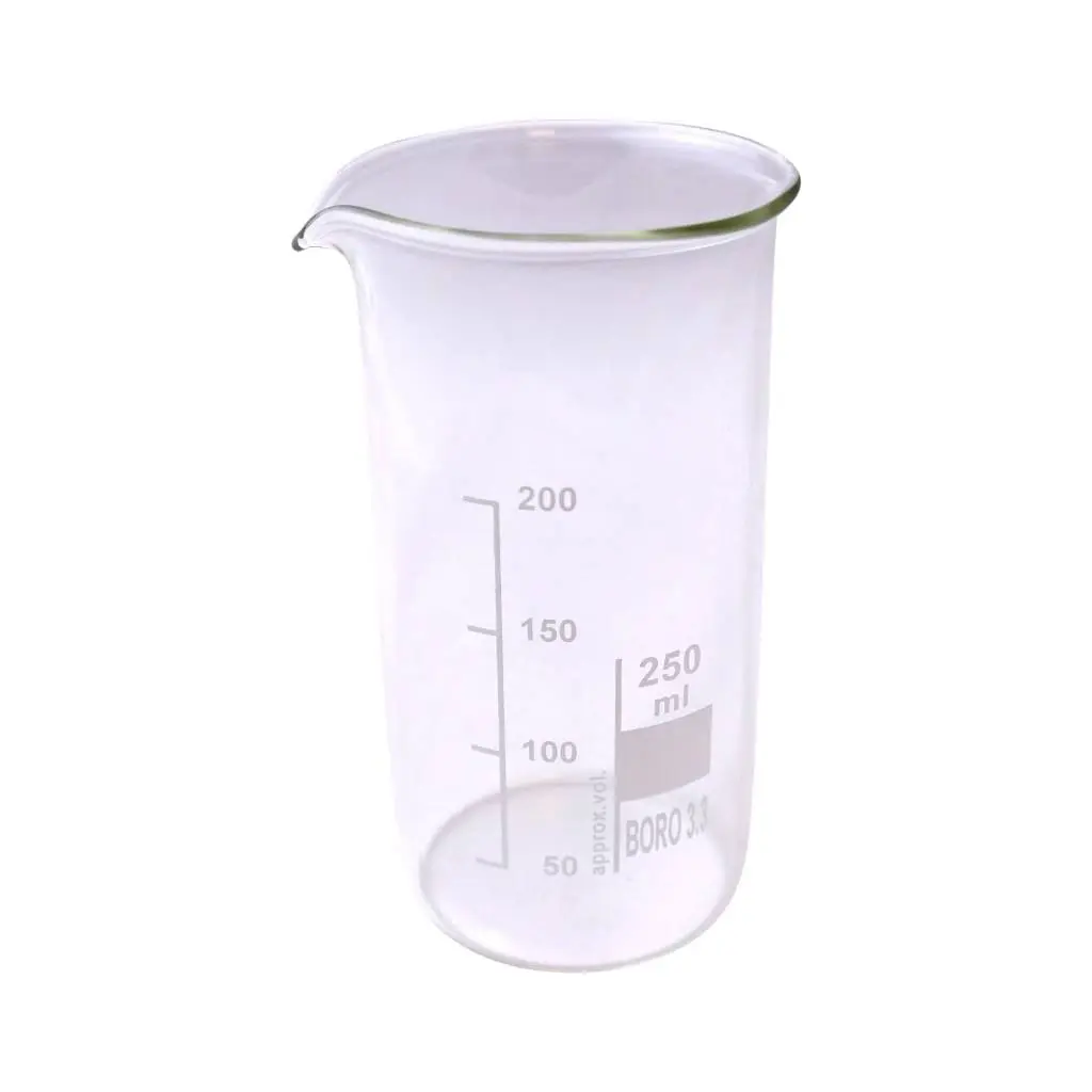 Maatbeker Glas 250ml voor de Cannolator van Stichting Mediwiet. Hittebestendig bekerglas met schenktuit. Gemaakt van Borosilicaatglas, geschikt voor het mengen van oliën en het verdampen van alcohol.