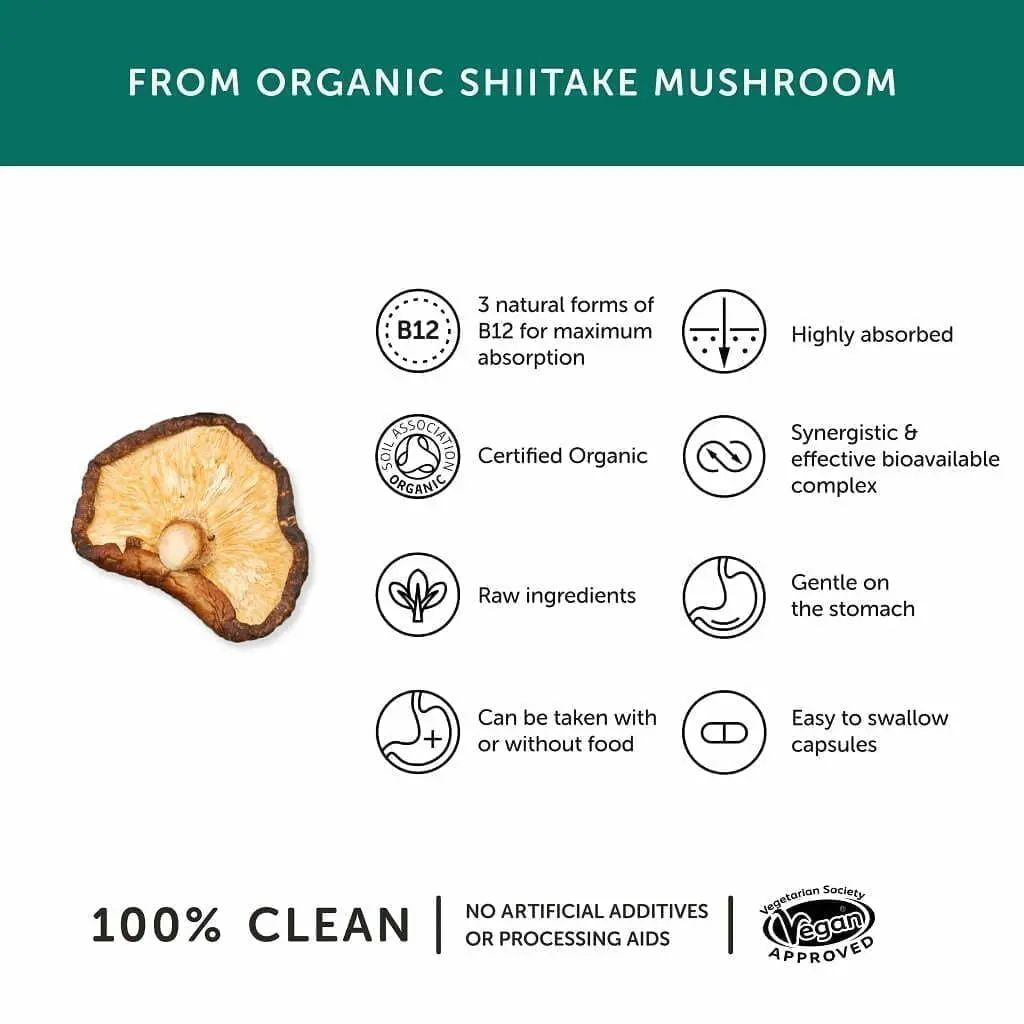Vitamin B12 Kapseln Bio, Vegan Vitamin B12 aus Shiitake und Austernpilzen, optimale Form von B12, leichter verdaulich und absorbiert.