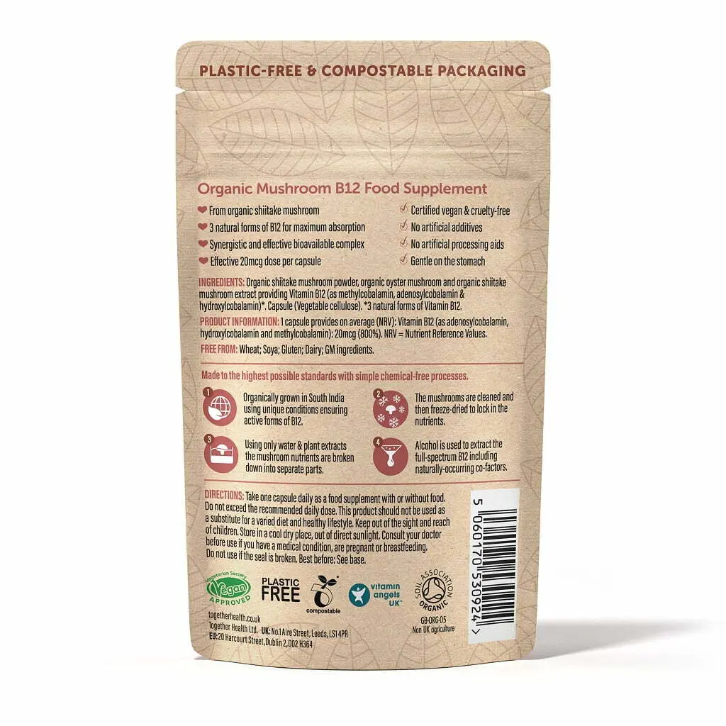 Veganes Vitamin B12 von Together Health. Dieses Vitamin B12-Supplement wird vollständig aus Pilzen gewonnen: Shiitake und Austernpilz. Mit drei natürlichen Formen von B12, ist es die optimale Form dieses Vitamins. Dadurch wird es leichter verdaut und vom Körper aufgenommen.