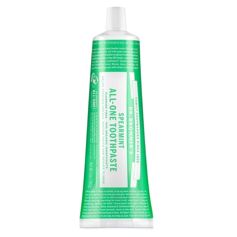 Dr Bronner Toothpaste Spearmint. Fluoride-free toothpaste made with organic spearmint oil for a long-lasting Spearmint-fresh-clean feeling!