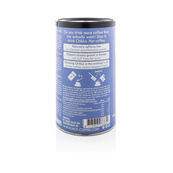 Chikko is dus geen koffie. Het is wel een heerlijke drank met een mooie diepe smaak en een subtiel bittertje. Zeker als je Chikko bereidt als cappuccino of koffie verkeerd lijkt je bakkie in onze ogen enorm op normale koffie. Chikko Not Coffee Cichorei koffie-alternatief bevat GEEN cafeïne. Dus het geeft je niet dat opgefokte gevoel. Leef lekker op je eigen energie. ‘s Avonds ook nog ‘n Chikko…? Geen probleem.