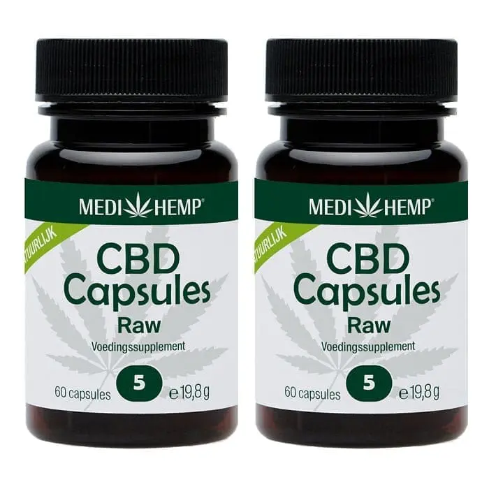 Avantage pack de 2 pots d’huile de CBD MediHemp Raw Capsules CO2 Extraction 5% CBD a 60. Les capsules de Medihemp ont été renouvelées ! Depuis novembre 2021 dans un nouvel emballage plus petit avec 60 petites gélules au lieu de 30 grandes gélules. Les petites capsules de CBD sont plus faciles à prendre. Le dosage a été adapté, passant de 1 à 2 gélules à la fois. Le nombre de milligrammes d’extrait de CBD a été légèrement augmenté. Pour les 5 %, il s’agit maintenant de ~27 mg par 2 petites gélules, au lieu de 25 mg par 1 grande gélule comme auparavant.