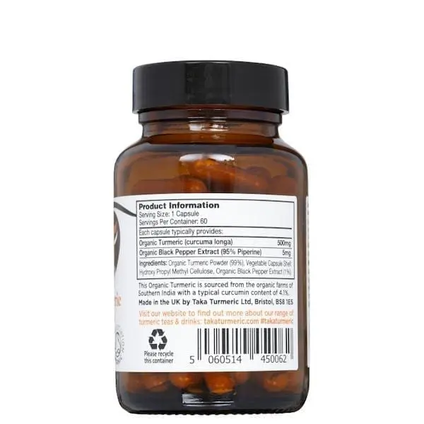 Capsules de curcuma longa biologique avec extrait de poivre noir par Taka Turmeric 60 pièces. Curcuma longa biologique sous forme de gélules pratiques avec un extrait de poivre noir. Convient aux régimes végétariens, végétaliens, casher et halal.