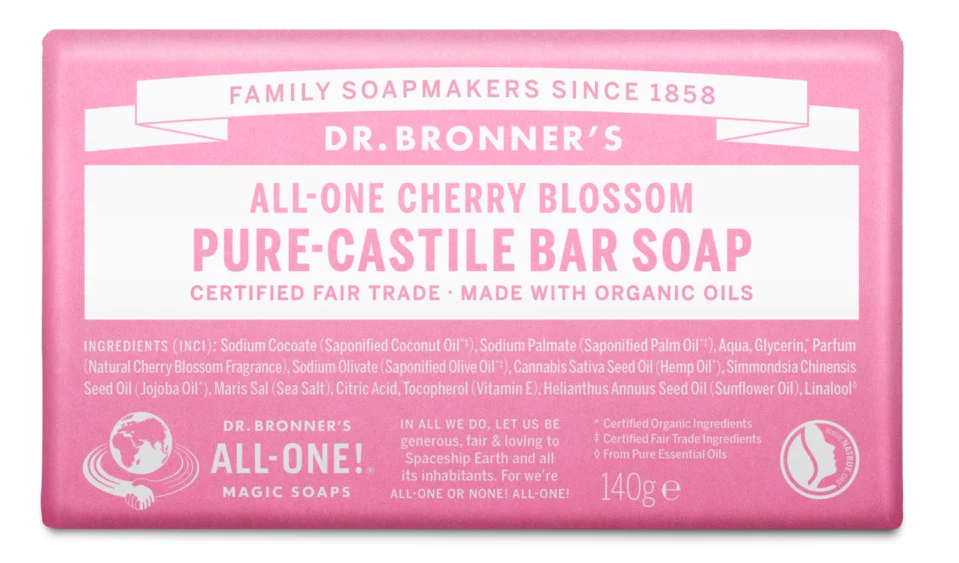 Dr. Bronners is wereldwijd bekend om zijn eenvoudige, pure formules van plantaardige zepen. Alle zepen zijn zowel fair trade als biologisch. De kersenbloesem zeep bar heeft een heerlijke geur die de zintuigen betovert.