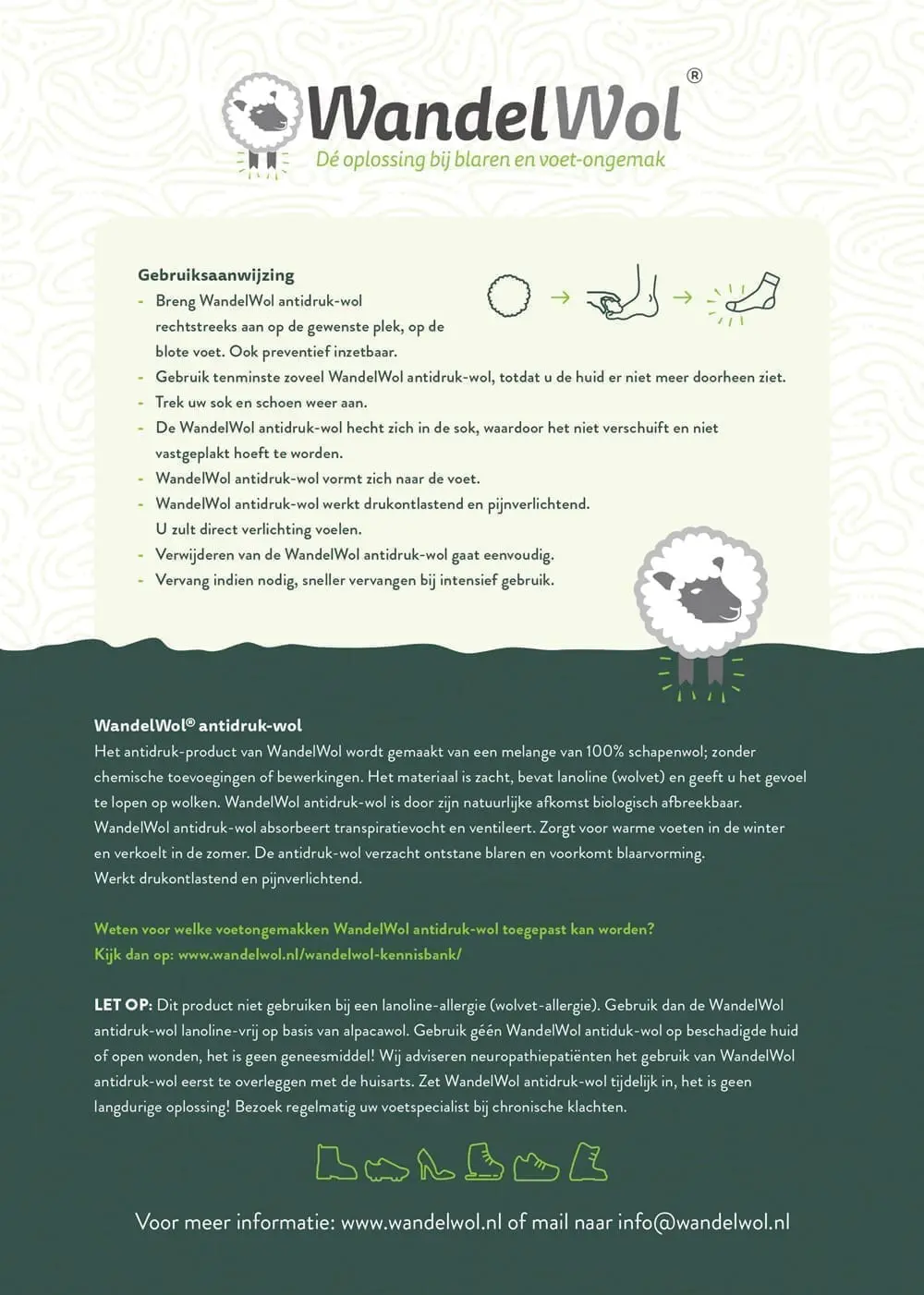 WandelWol antidruk-wol is door zijn natuurlijke afkomst biologisch afbreekbaar. WandelWol antidruk-producten absorberen transpiratievocht en ventileren. Zorgt voor warme voeten in de winter en verkoelt in de zomer. De antidruk-wol verzacht ontstane blaren en voorkomt blaarvorming. Werkt druk-ontlastend en is een behoud voor teennagels en voeten. Velen gingen u al voor!