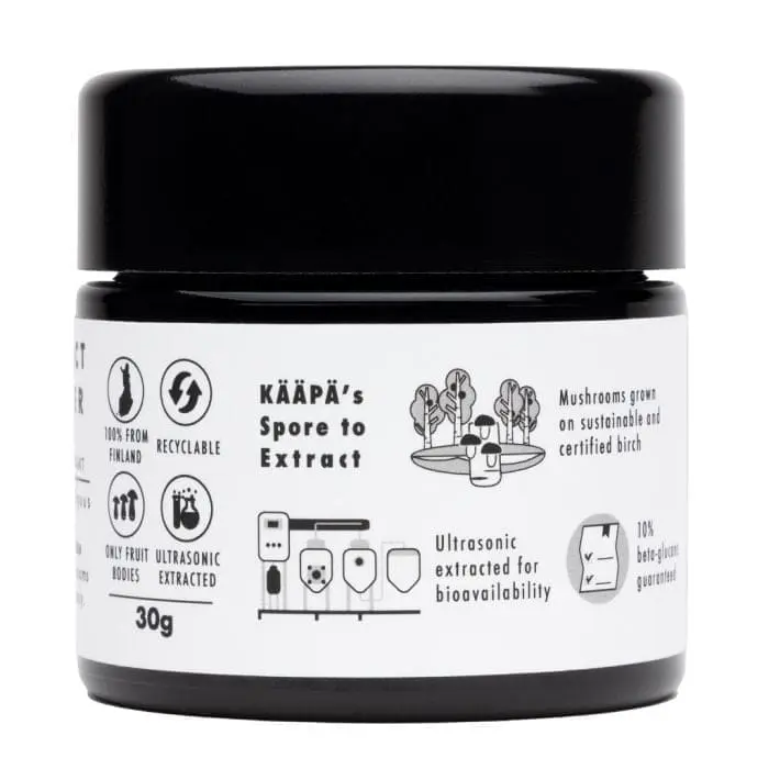 Dit poeder extract van KÄÄPÄ Mushrooms bestaat uit biologisch Chaga extract dat wordt geoogst en verpakt in Finland. Het poeder bevat uitsluitend vruchtlichamen, zonder de toevoeging van granen of andere vulstoffen. Dankzij een modern extractieproces (ultrasone geassisteerde extractie) komt de Chaga volledig tot zijn recht en bevat het waardevolle stoffen, waaronder minimaal 10% bèta-glucanen gestandaardiseerd.