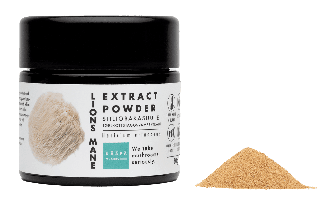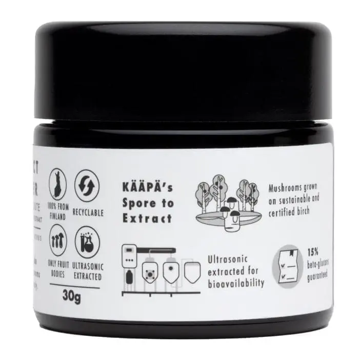 Lion’s Mane Extract Poeder van KÄÄPÄ Mushrooms BIO 30 gram, gekweekt en verpakt in Finland. Bevat minimaal 10% bèta-glucanen, dankzij ultrasone extractie.